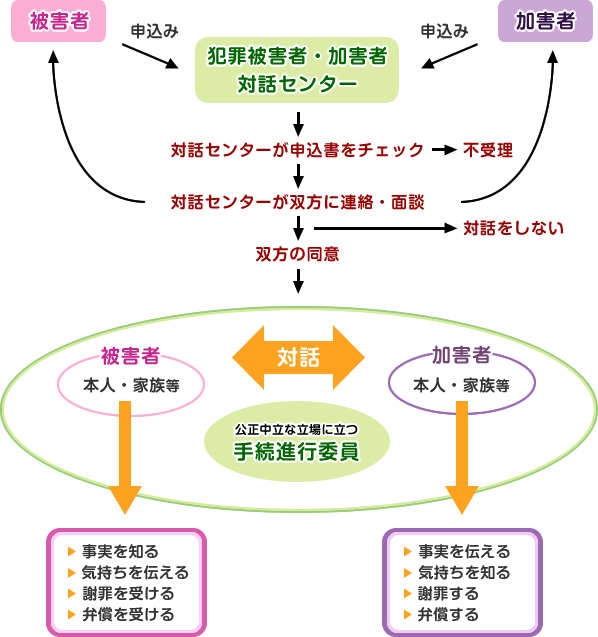 適切でないと判断した場合は対話の仲介や、謝罪文の預かりをお断りすることがあります。 - 詳しくは、兵庫県弁護士会 犯罪被害者・加害者センターまで、お問い合わせ下さい。
